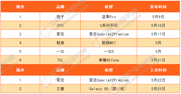 中商情报网讯 2017年5月手机市场还是那么热闹,各大手机厂商不断推出新手机和多款新手机也陆续上市发售了。抢不到上月小米6的朋友们,这个月除了有锤子的坚果Pro外,还有魅族MX7和一加5等旗舰机。另外,今年还是苹果手机10周年,备受瞩目的iPhone十周年版本技术上突破又将如何呢?现在,我们还是看看5月份国内有哪些上市和准备发布的新手机吧! 5月份手机的发布会就多达6场,其中见过Pro、HTC的U系列手机、一加5等多款手机发布上市。错过了上月小米6的朋友们,这个月我们有魅族MX7和一加5等旗舰机,据悉,魅族MX7将纹识别Home按键,运行Flyme6系统,屏占比以及黑边控制都相当出色。一加5处理器将采用高通骁龙835,搭配5.5英寸2K分辨率屏,电池容量高达4000mAh,将支持快充,续航和快充也得到提升。 另外,本月将有2款手机上市发售,值得关注的是,GalaxyS8/S8+(国行版)也将在本月25日上市发售。
